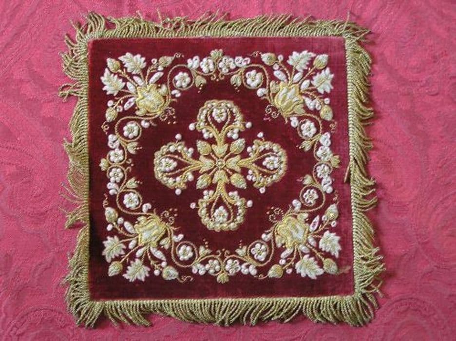 velours uni (rouge) : brodé ; fil métal (or, argent) ; soie ; perle