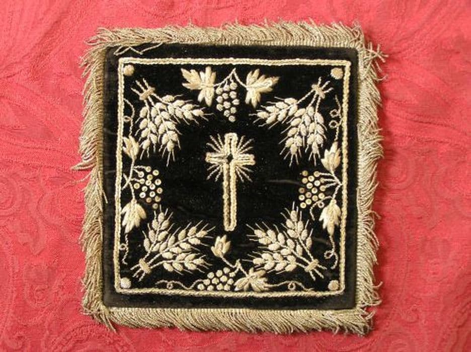 Pale en velours noir chargé d'une croix latine brodée en canetille et paillettes argent, rayonnante du même cantonnée d'épis de blé et de grappes de raisin en canetille, paillettes et filé, encadrée d'un filet du même, bordée d'une frange d'or.