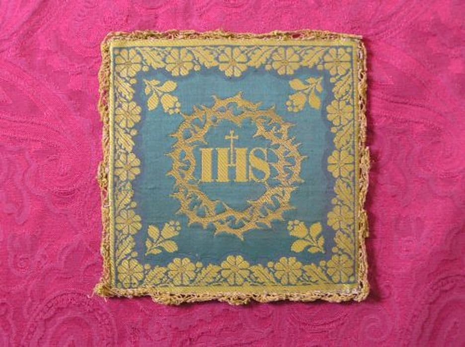 Pale en damas gros de Tours en soie verte brochée d'un IHS moderne de soie sommé d'une fine croix latine pattée d'or dans une couronne d'épines ondé soie jaune, cantonnés de quatre boutons de fleurs et entourés d'une frise de feuillages fleurs stylisés jaune, le tout encadré d'un filet du même, bordée d'une dentelle jaune.