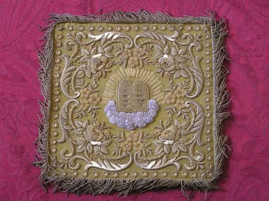 Pale en drap d'or chargé d'éléments rapportés : en coeur, les Tables de la Loi dorées posées sur des nuées d'argent et rayonnant de paillettes dorées (canetille or et argent, filé or, soie noire). Autour, des rinceaux de roses tigées et feuillées et de fleurettes à cinq pétales le tout doré. Encadré par un filet de rosettes dorées (canetille et paillons). Bordure de franges dorées.
