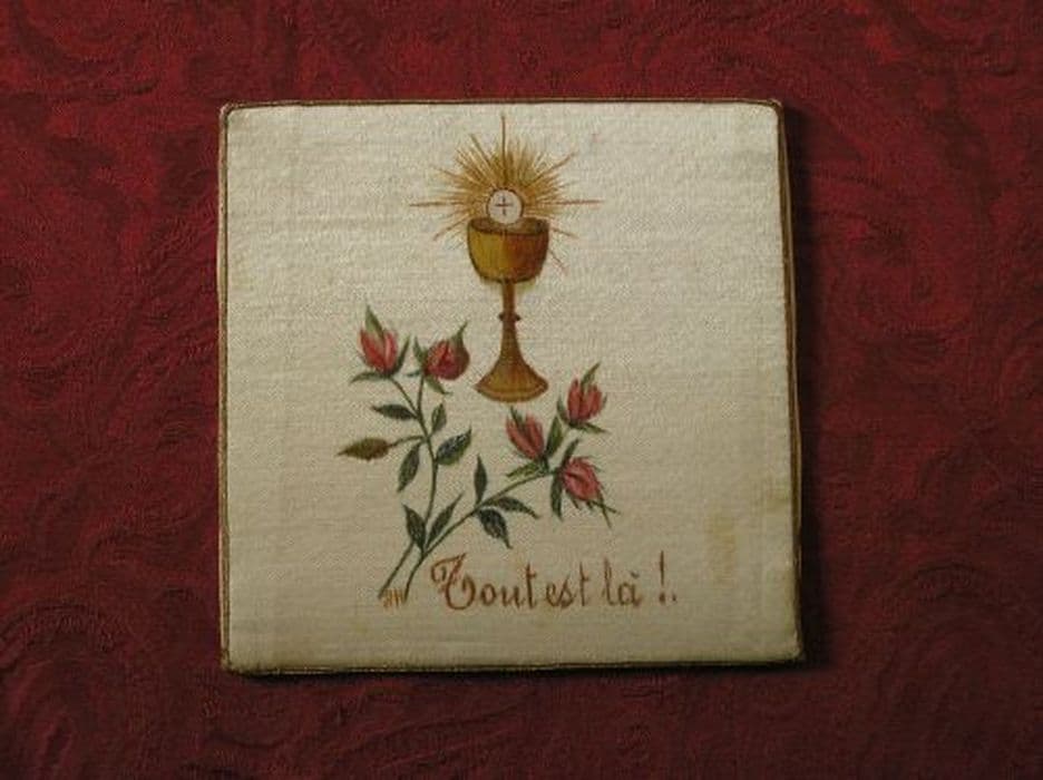 Pale en satin effet sergé écru pinceauté : calice effet doré, sommé d'une hostie blanche rayonnante d'or ; dessous deux branches de roses au naturel, posées en bande et en barre.
