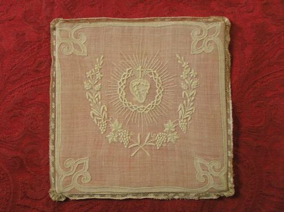 Pale en fils de lin blanc brodé au passé, point de tige et remplissage : coeur ensanglanté et enflammé, sommé d'une croix latine, inséré dans une couronne d'épines, le tout rayonnant, entouré de deux décors : grappes de raisin, épis de blé et fleurettes, tigés et feuillés passés en sautoir, encadré par un filet cantonné d'un motif baroque, le tout sur un fond rose. Bordure en dentelle blanche.