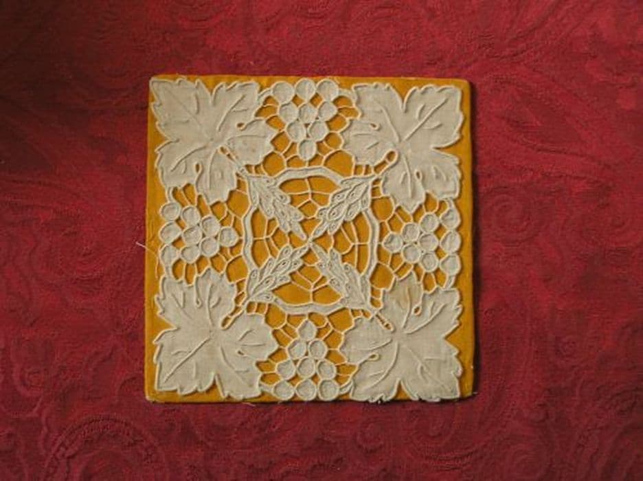 Pale en lin blanc ajouré brodé au fil : couronne brochant sur quatre motifs cantonnés d'épis de blé, de grappes de raisin et de feuille de vigne, sur un fond taffetas orangé.