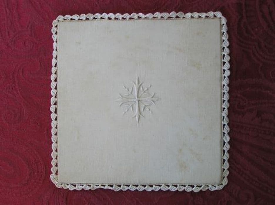 Pale en lin blanc brodé au passé et point de tige d'une croix grecque tridentée rayonnante d'un motif végétal. Bordure au crochet.