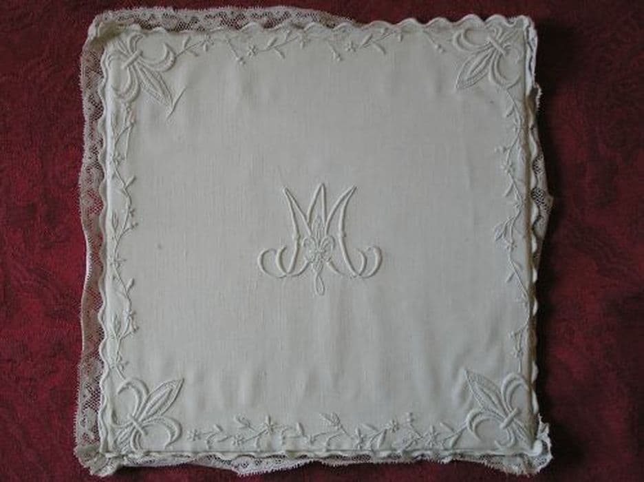 Pale en lin blanc uni brodé au passé et point plat des lettres A et M en italique majuscule entrelacées, frappées en coeur d'une fleur de lys le tout encadré par un filet végétal et cantonné d'une fleur de lys. Bordure en dentelle.