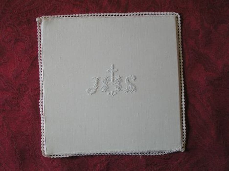 Pale en lin blanc uni brodé au passé et point plat des lettres IHS fleuries surmontées d'une croisette formée par quatre pétales et s soutenues par les trois clous de la Passion. Bordure au crochet.