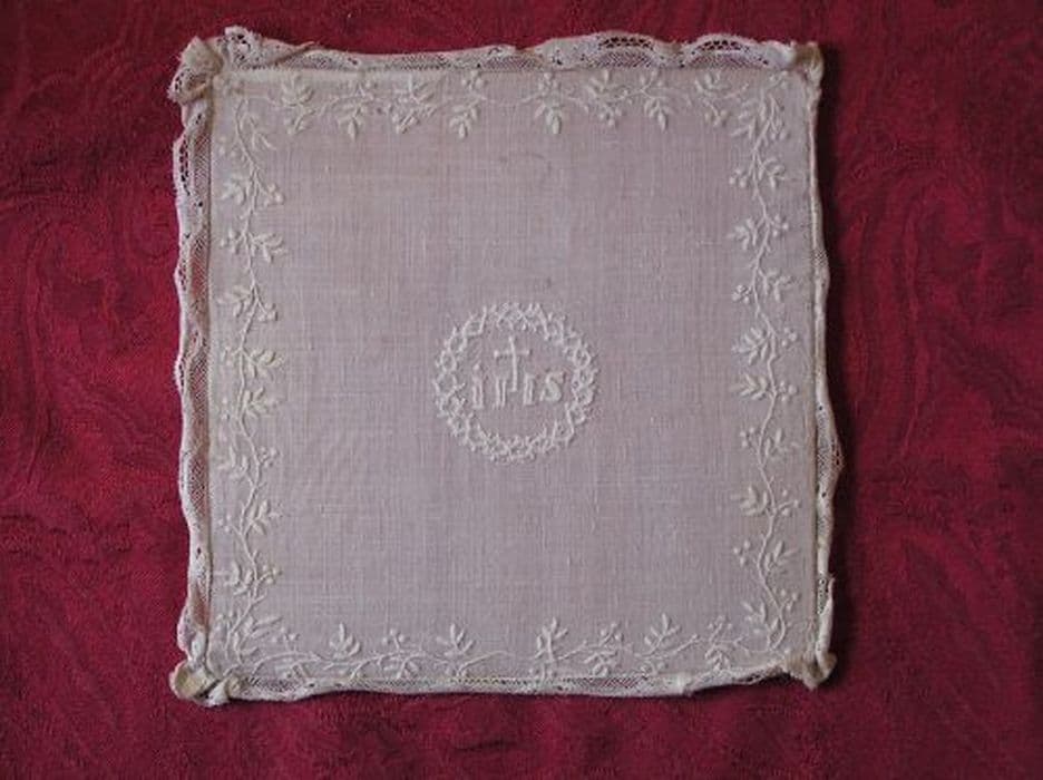 Pale en lin blanc transparent sur fond rose. Bordure en dentelle.