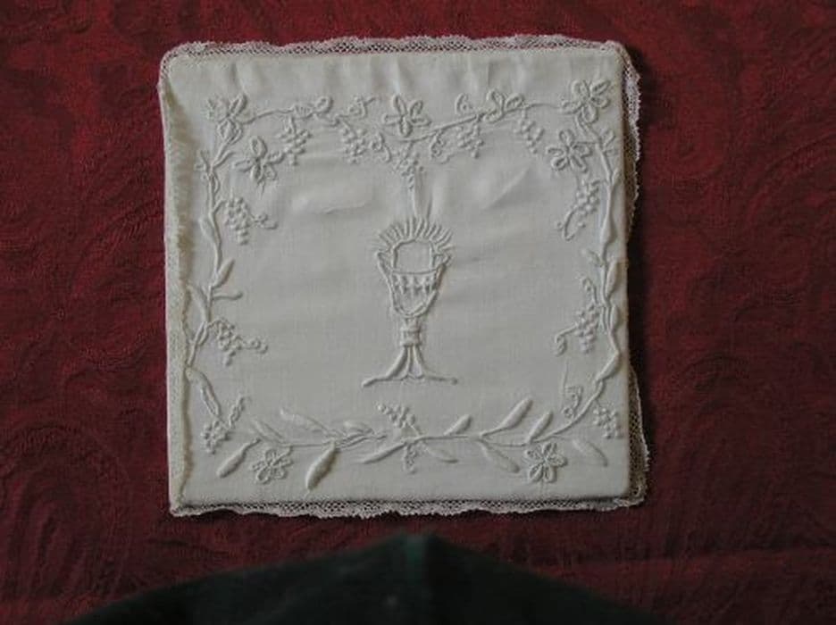 Pale en lin blanc uni brodé au passé en relief. Bordure en dentelle.