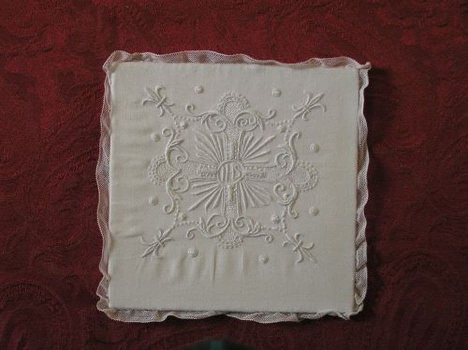Pale en lin blanc uni brodé au passé en relief. Bordure en dentelle.