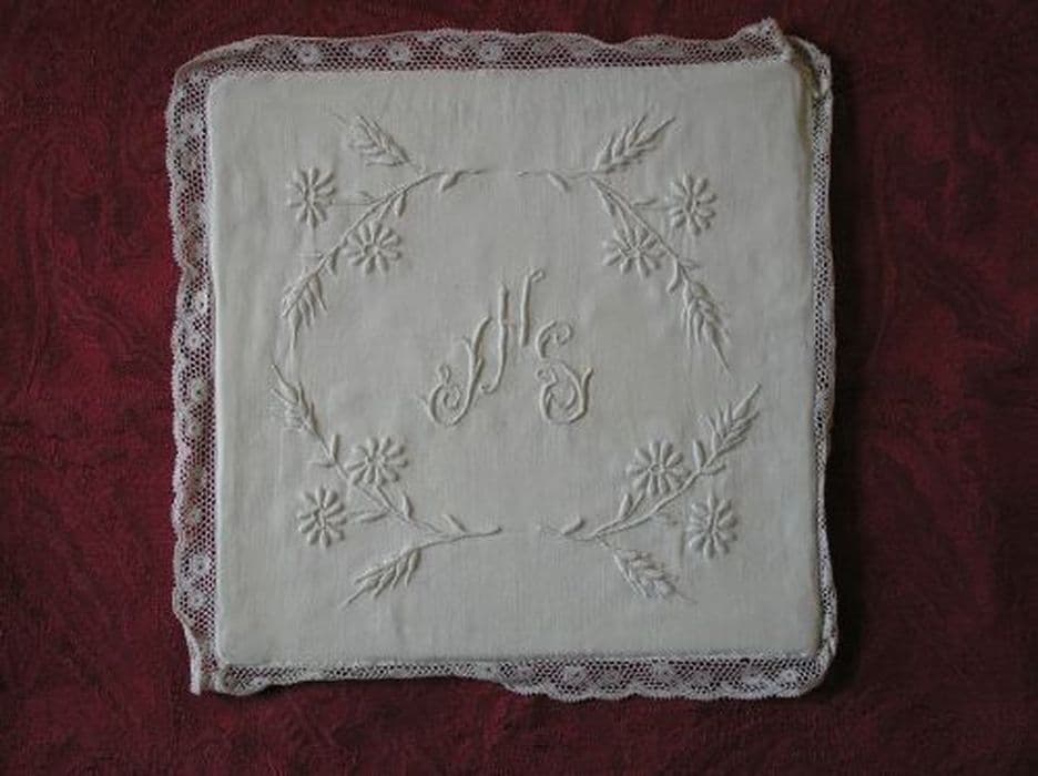 Pale en lin blanc uni brodé au passé. Bordure en dentelle.