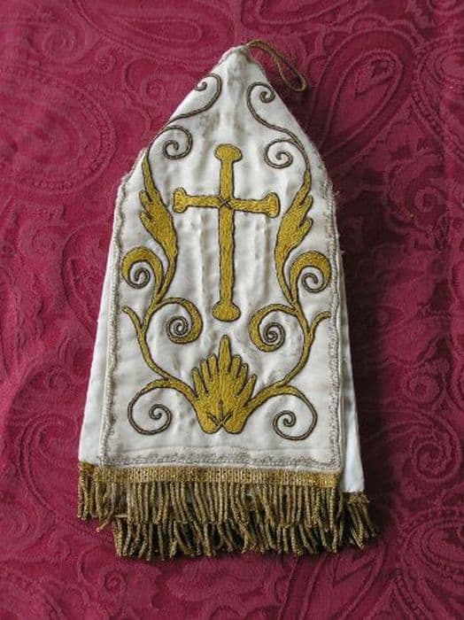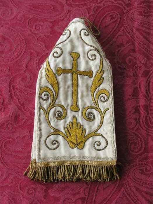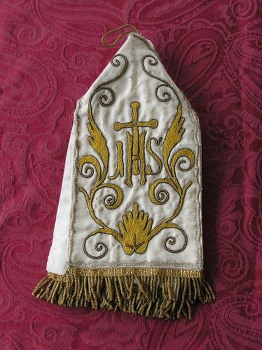 Pavillon de ciboire en gros de Tours crème à quatre pans brodés de soies jaunes, marron et filé d'or. Petit galon en passementerie d'or. Franges dorées. Doublure en satin crème.