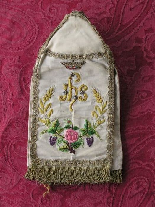 Pavillon de ciboire en gros de Tours crème à quatre pans, brodés de soies polychromes au passé, point de noeud et point de tige. Petit galon ondé en passementerie or, franges dorées de deux centimètres. Doublure crème.
