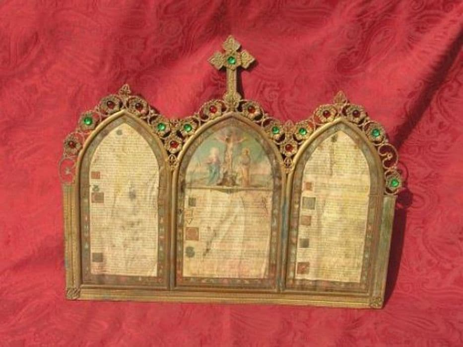 Le canon central est composé de trois éléments, l’ensemble inséré dans un entourage gothique en laiton, surmonté d’un décor de rosaces chargées de cabochons de verre rouge ou vert, une croix tréflée sommant le tout. Les deux canons latéraux sont semblables.