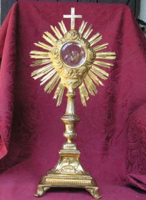 Ostensoir en argent doré dans un coffret en bois gainé de papier noir, dont l'intérieur est tapissé de velours orangé. Pieds en volute. Base rectangulaire au redent concave chargé de godrons. Dessus rectangulaire gravé d’une frise d’opercules et de perles alternés d’où émerge une pyramide tronquée courbe décorée au repoussé. Entablement bordé d’une frise d’opercules et de perles, surmonté d’un coussin décoré orné de feuilles. Noeud en forme d’urne agrémentée de feuilles à la partie inférieure, de deux grappes de raisin feuillées en relief dans un ovale en coeur et ceinturé d’opercules et de perles au sommet. Partie supérieure du fût conique cannelé. Collerette supérieure ornée d’opercules et de perles. Monstrance circulaire entourée de nuées chargées de cinq têtes d’anges ailés. Gloire à rayons droits.