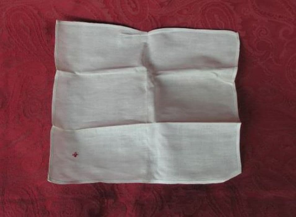Purificatoire en lin blanc avec croisette rouge brodée à un coin.