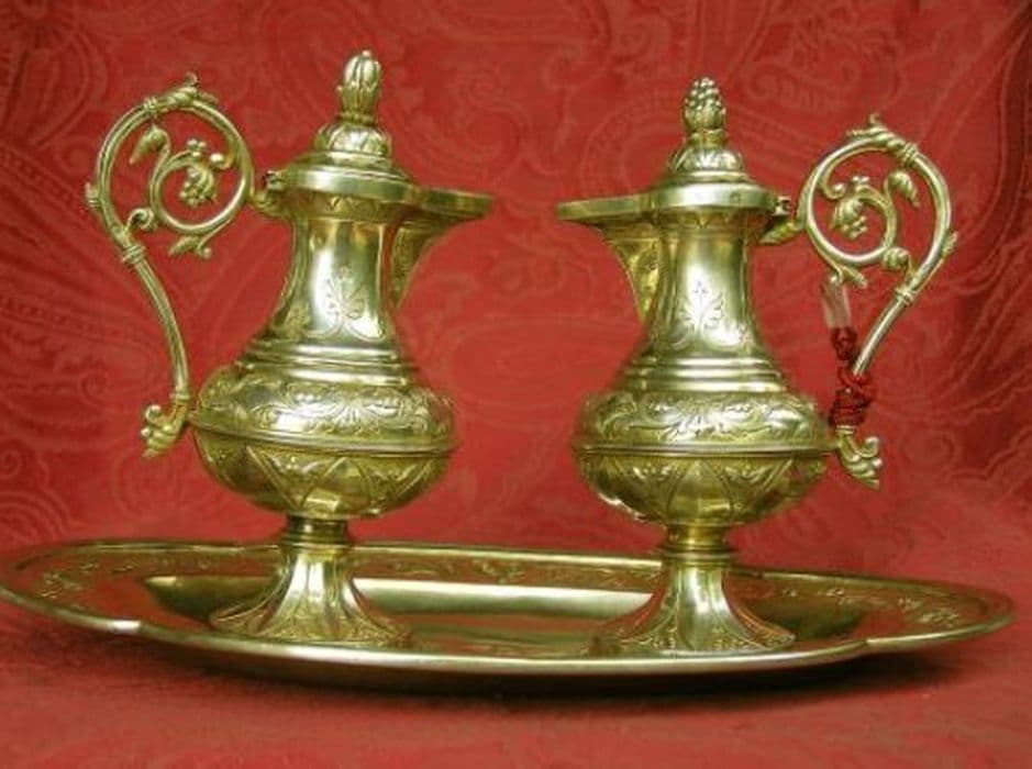 Plateau ovale avec redent au marlis à décor embouti de rinceaux. Deux burettes sur pied circulaire orné d’une frise de triangles gravés. Dessus à huit palmes se rejoignant au niveau du fût, insérant huit petits motifs de végétaux. Collerette circulaire lisse. Panse ventrue à huit palmes se rejoignant insérant huit petits motifs de végétaux à la base et une guirlande de rinceaux fleuris au sommet. Partie haute gravée d’une frise végétale stylisée. Bord supérieur décoré d’une frise de triangles gravés. Couvercle à trois niveaux avec frise de triangles gravés et chapeau de petites palmes ; sommé d’une grappe de raisin pour le vin et de masses de roseaux pour l’eau. Anse en rinceau végétal.