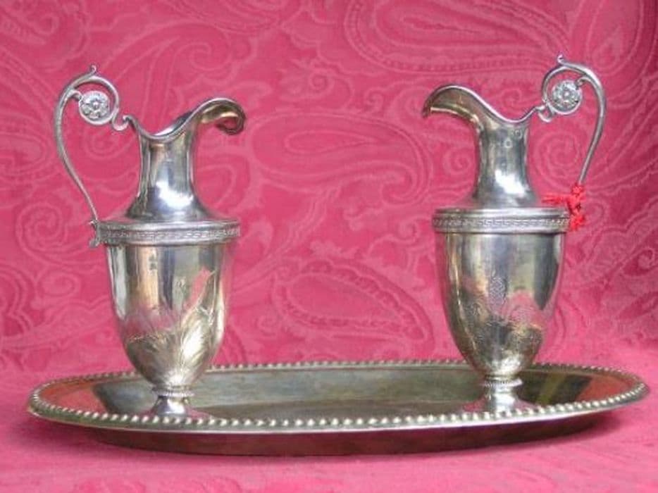 Plateau ovale au marlis à décor embouti de perles. Burettes à pied circulaire orné de guillochures sur le dessus. Panse oblongue à décor végétal gravé d'un cep de vigne feuillé et fruité pour le vin et d'une masse de roseau pour l’eau. Frise grecque gravée au sommet. Anse terminée par une rosace. Bec très débordant.