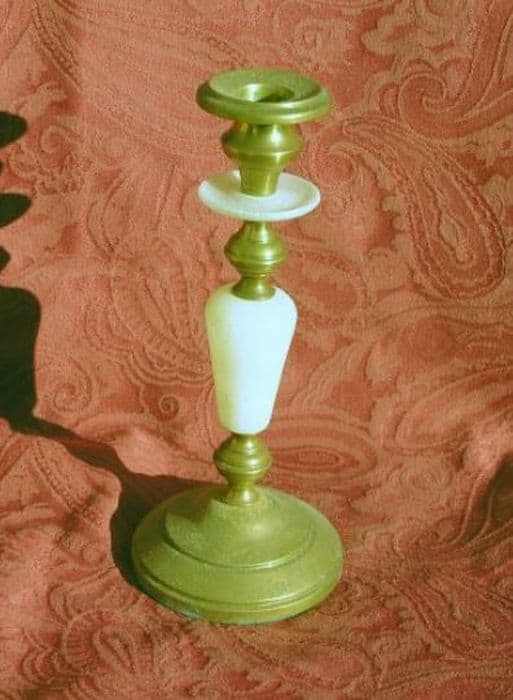 Pied circulaire uni. Fût en laiton. Noeud oblong en porcelaine translucide. Coupelle en porcelaine translucide.
