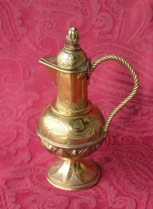Burette en argent doré sur pied circulaire surmonté de feuilles se rejoignant pour former un cône. Petite collerette basse. Panse ornée de feuilles de sauge stylisées d’où émerge un pistil. Fine collerette médiane. Dessus décorée de masses et de feuilles de roseaux. Partie supérieure cylindrique décorée d’une frise de feuilles à la base. Poignée torsadée. Couvercle surmonté d’une coiffe orné d’une frise de feuilles. Sommet terminé par un gland stylisé.
