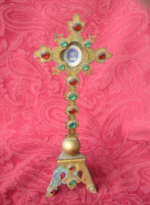 Base pyramidale tripode gravée de rinceaux et chargée sur chaque face de quatre verroteries vertes et rouges, l’ensemble surligné d’une frise. Sphère constituant le pied du fût. Fût plat à quatre redents, gravé d’un motif végétal et chargé de quatre boules de verre vertes et rouges. Présentoir quadrilobe à redents curvilignes se terminant en croix tridentée avec décor similaire à celui du fût.