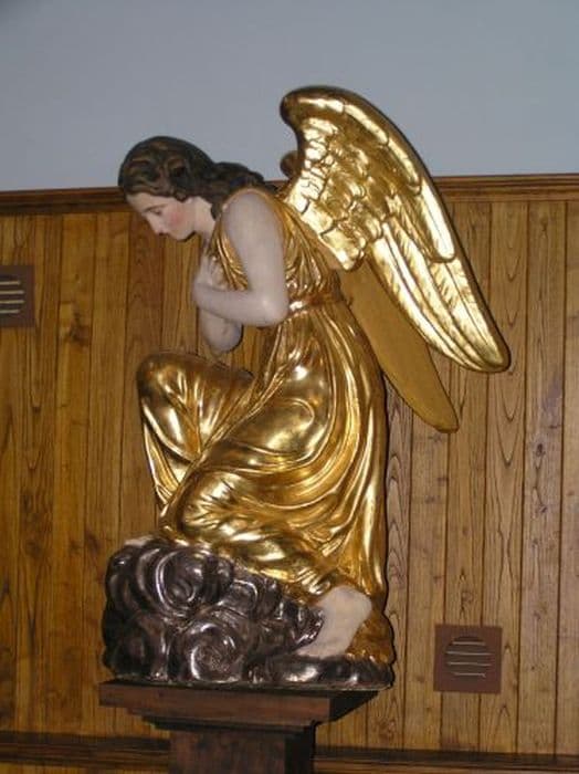 Anges adorateurs agenouillés, l’un les mains l’une sur l’autre, la tête baissée et l’autre les mains jointes ; la tête levée vers le ciel.