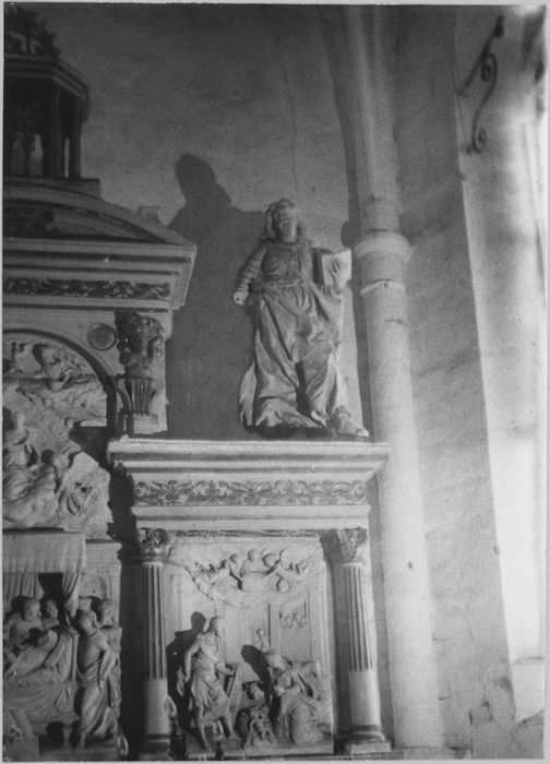 Saint Paul, statue, pierre, 16e siècle (surmontant la partie droite du maître-autel), 12-01-1977.