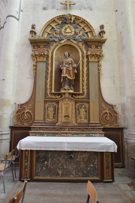 Autel en pierre, habillée bois peint faux marbre, avec devant d'autel en marbre. Retable en bois peint et doré.