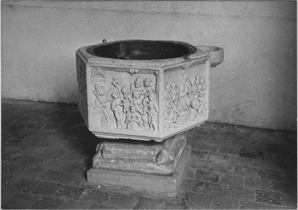 Hexagonal. Une petite vasque communique avec la cuve.£Sur deux faces, des anges portent des cartouches avec des inscriptions : un passage de saint Marc et la date 1550. Un jeune homme est accompagné des vers de saint Jean.