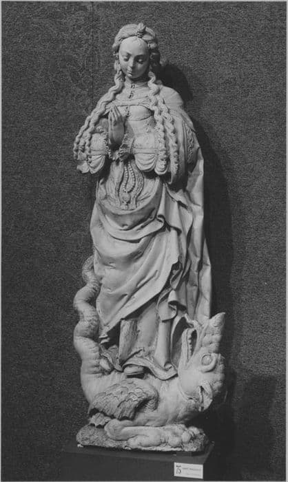 Sainte Marguerite est représentée juchée sur le dos du dragon. Elle est en oraison, les mains jointes sur la poitrine. Sa tête baissée indique le dragon qui expire à ses pieds. Son visage est rond et délicat, légèrement joufflu. Elle a les yeux saillants, en amande, le nez court et droit, une bouche étroite et pincée qui esquisse un sourire à peine perceptible. Ses cheveux sont richement ornés d'une double enfilade de perles qui fait le tour de sa tête et s'enroule au sommet de son front pour former un petit chignon. Sa chevelure est retenue en arrière par une résille qui laisse échapper quelques mèches ondulantes, rondes et épaisses qui tombent en cascade le long de ses bras jusqu'à ses coudes. Ses sourcils, fins et courbés, sont finement exécutés. Ses vêtements sont représentatifs de l'habillement bourgeois féminin du XVIe siècle : elle est parée d'un grand mantel attaché sur sa poitrine par une cordelette à pompons. Ce mantel est rabattu sous son coude, dans un mouvement allant de la droite vers la gauche, formant de lourds drapés qui lui couvrent les jambes. Sous son manteau, sainte Marguerite revêt une longue robe constituée d'un profond décolleté carré, ourlé d'un galon brodé. Au bas de celle-ci, on peut voir qu'elle est chaussée de souliers marrons à bouts ronds. Elle porte également une chemise blanche agrémentée d'une gorgerette et de manches animées par un jeu de rubans qui les enfle à intervalle régulier. Une imposante patenôtre, flanquée d'une médaille, s'enroule autour des poignets et tombe en serpentant sur le ventre. De part et d'autre de la patenôtre ondulent les deux extrémités d'une ceinture verte probablement nouée sous la poitrine. Il faut signaler ici la profusion de perles n'est pas anodine (représentatives de l'habillement des femmes bourgeoises du 16e siècle et d'autre part, Marguerite, qui vient du latin « margarita » qui signifie « perle »). Le monstrueux dragon est représenté sous les pieds de Marguerite. Ses larges pattes griffues et ses ailes dentelées sont repliées. Sa queue massive ondule en remontant jusqu'au bassin de la sainte. Ses yeux sont gros et globuleux, sa peau est écailleuse. Haletant, il tourne la tête en arrière pour regarder en direction de Marguerite, sa langue pend au-dehors de sa gueule féroce, animée de dents pointues. Il paraît maîtrisé, terrassé, agonisant.