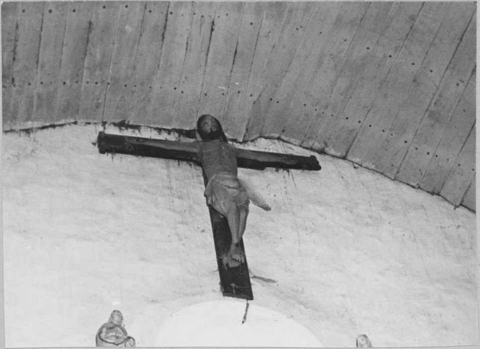 Le Christ en croix, la Vierge et saint Jean, statues, bois, 16e siècle, 09-10-1961.
