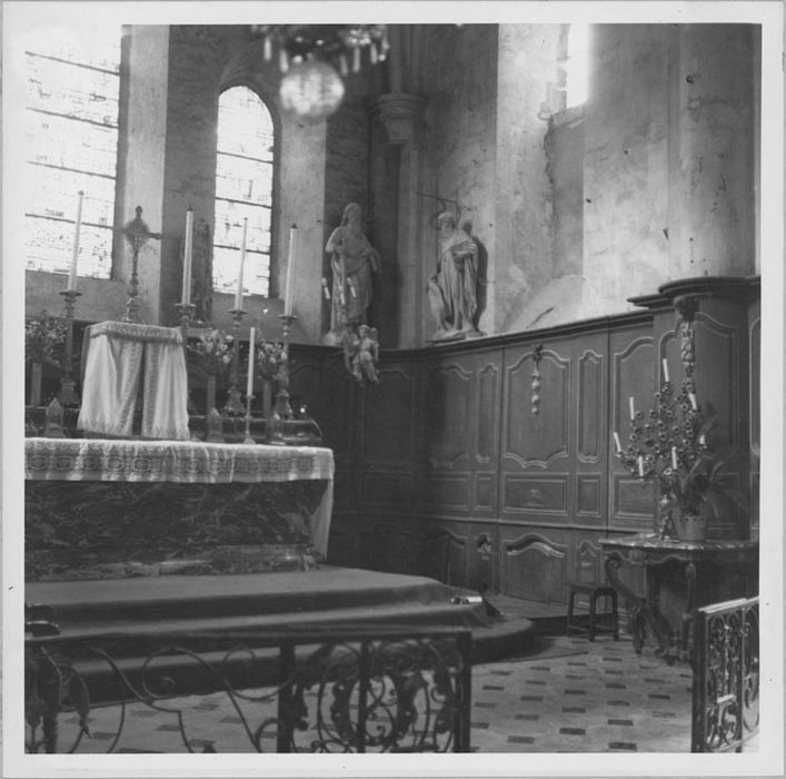 Ensemble constitué par le maître-autel et son tabernacle, les boiseries du choeur et de l'avant-choeur, deux consoles et l'appui de communion, marbre, bois sculpté et fer forgé, début du 18e siècle, 27-07-1959.