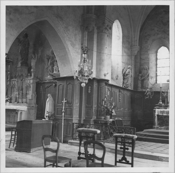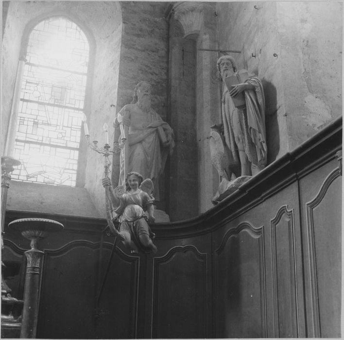 Les statuettes ont été remployées. Où ? Elles sont actuellement remisées (armoire mur ouest). Précédent signalement : choeur.