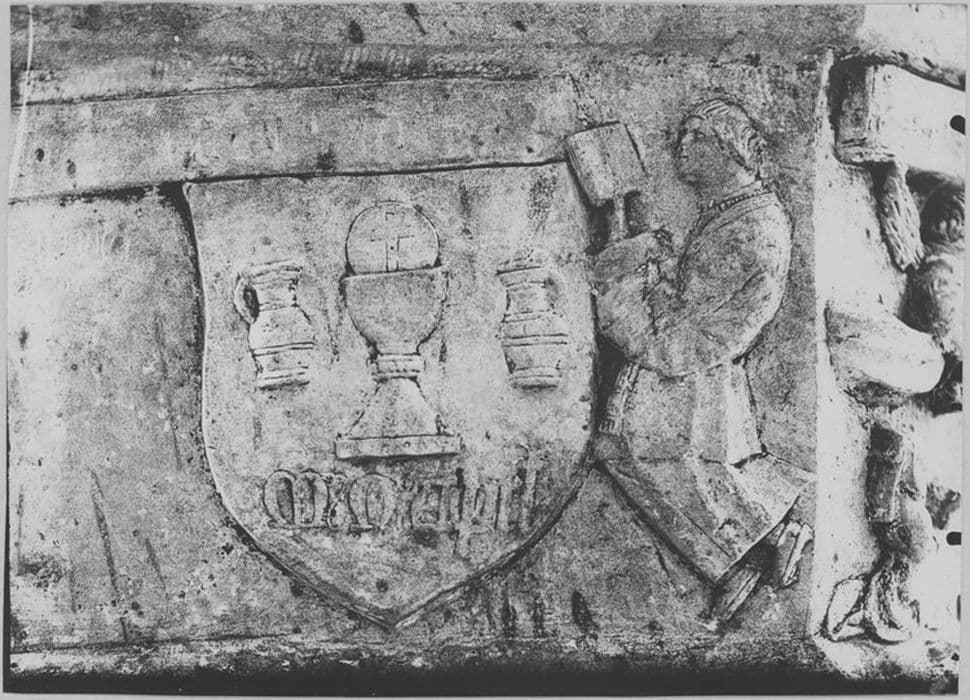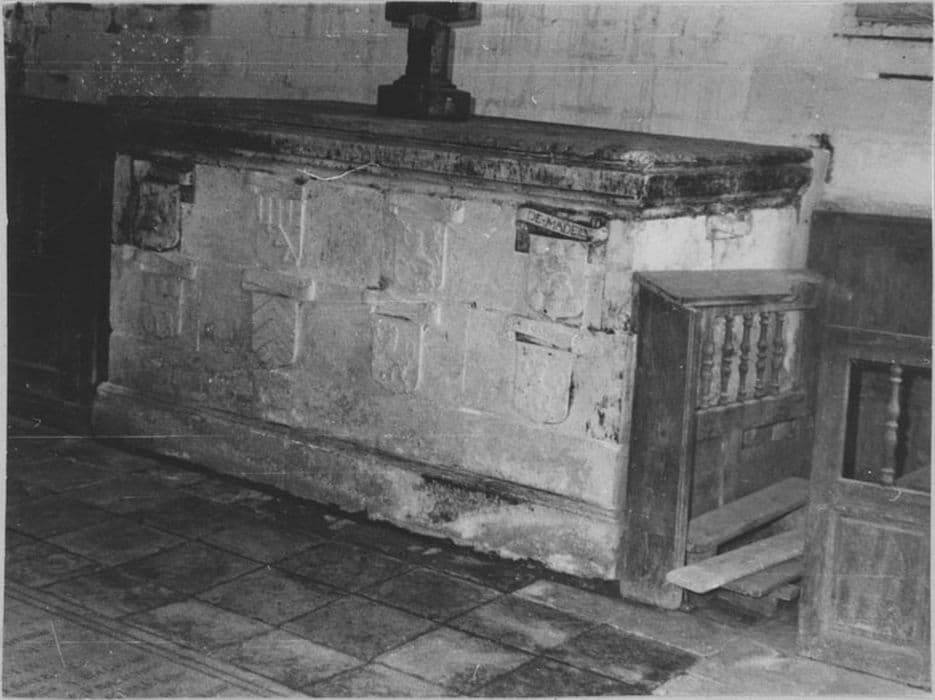 Huit écussons en moyen-relief décorent la face principale du tombeau ; quatre autres écussons ornent les deux côtés.