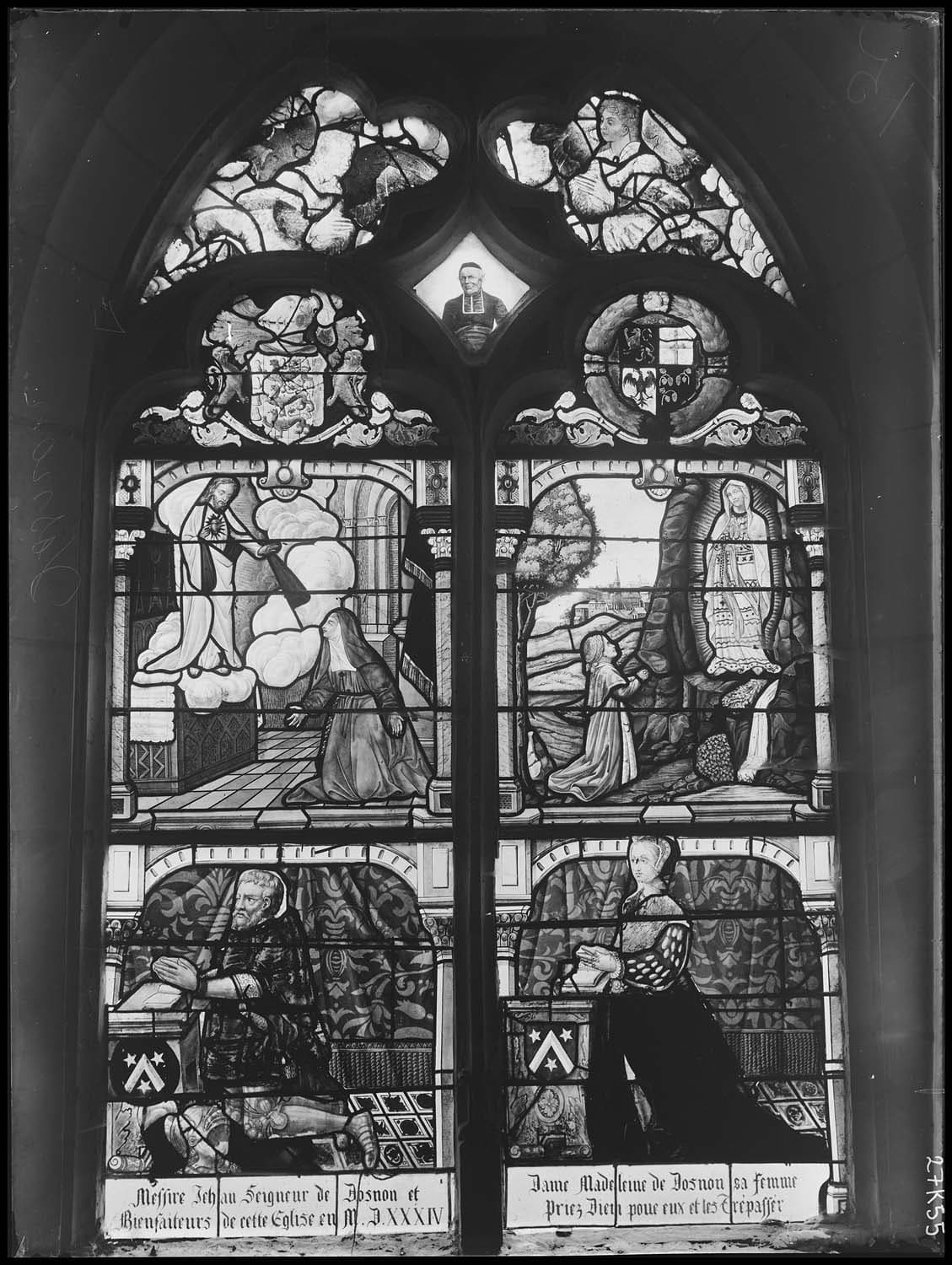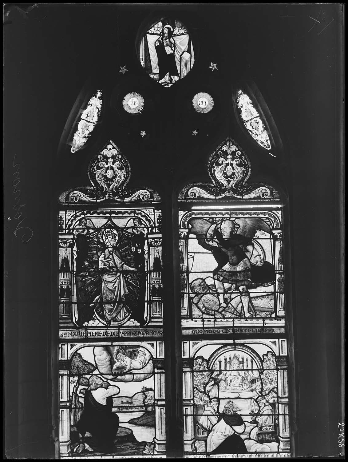 Verrière : Légende de saint Sébastien, Vierge et l'Enfant, saint Michel, Vieillards de l'Apocalypse, Jugment de Salomon, donateur, Adoration des Mages, sainte Marguerite, Marie-Madeleine