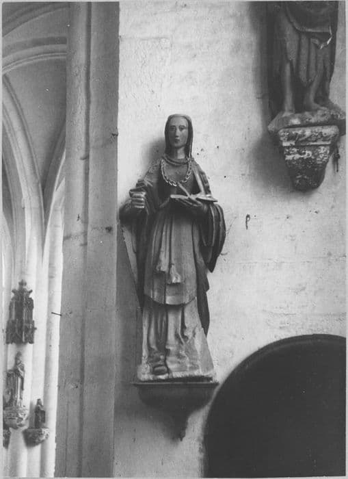 Sur le côté senestre et en bas de la sculpture, il y a un replat contre lequel elle devait prendre appui.£La sainte porte deux colliers de verroterie autour du cou.