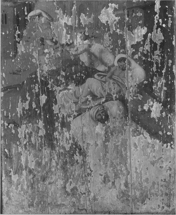 Importantes lacunes de la couche picturale. Contour des personnages restitués.