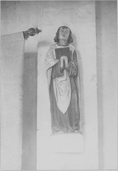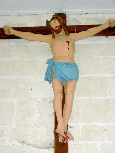 La Vierge est figurée debout, en oraison, et regarde droit devant elle. Jean est représenté imberbe. Il est pieds nus et porte une chasuble présentant des plis assez anguleux au-devant. Les mains jointes, il serre un livre contre sa poitrine en inclinant légèrement la tête vers le haut. Le Christ, crucifié, porte la couronne d'épines ainsi qu'un perizonium au drapé rigide. Sa tête, inclinée vers le bas, ses yeux dans le vide et sa bouche ouverte font tendre son expression vers celle de la douleur.