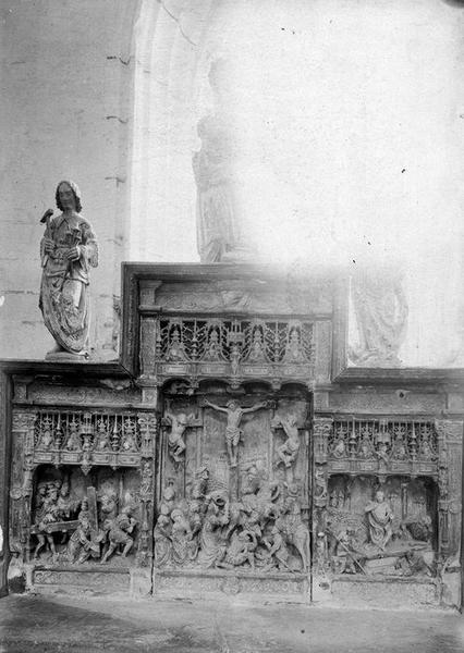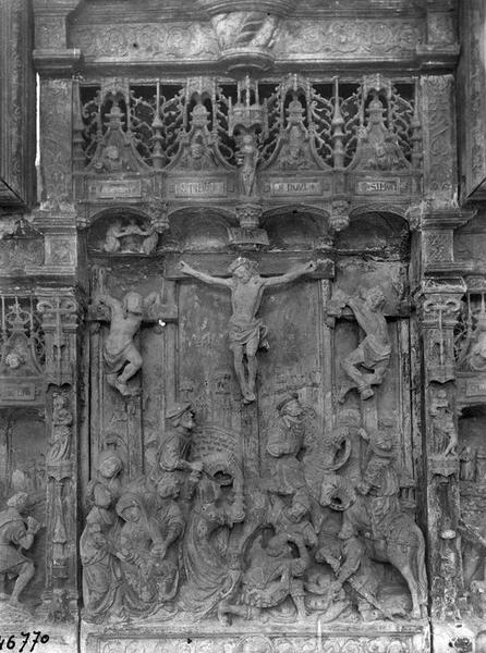 Retable, haut-relief : Portement de Croix, Crucifixion, Résurrection
