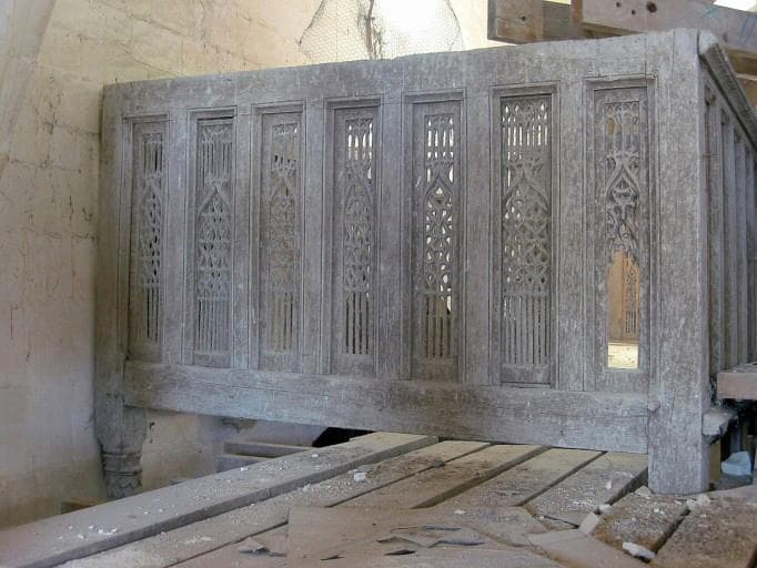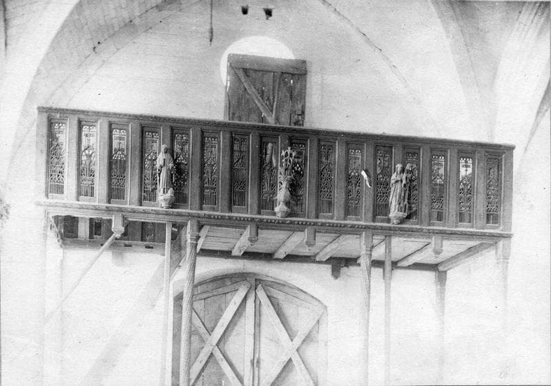 La balustrade est composée de 46 panneaux sculptés, en fenestrages gothique ajouré. Colonnes à écailles, colonnes torses.£Avec écu peint.