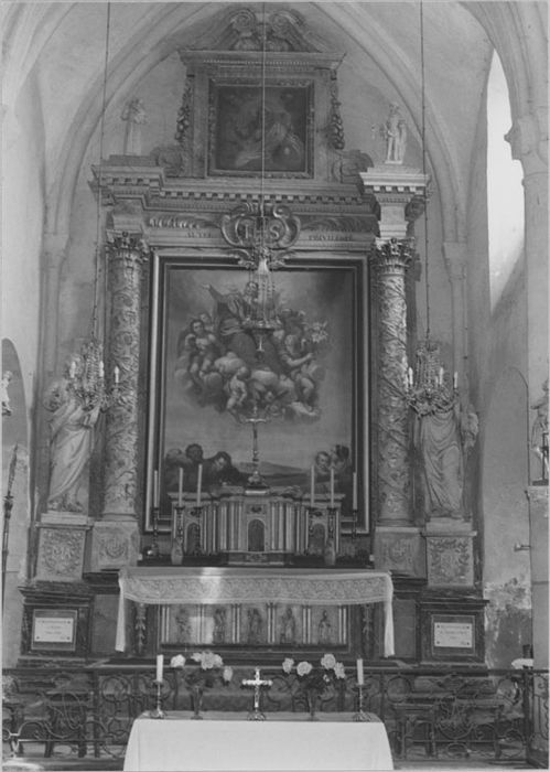 Maître-autel, tabernacle et retable, bois sculpté peint et doré, 17e siècle, l'Assomption, toile, 1854 et Dieu le Père, toile, 17e siècle, 11-12-1980.