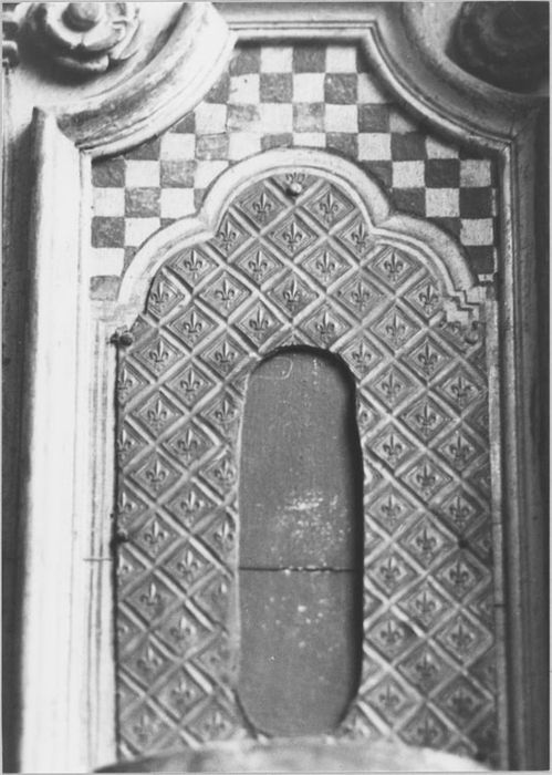 Châsse de Saint Victor, avec six niches (à statuettes disparues) ornées de plaques de bronze, 15e siècle, décorées de fleurs de lis, bois peint et doré, 17e siècle, 30-11-1984.