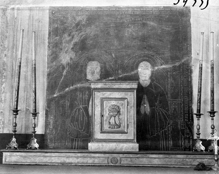Dalle funéraire à effigies gravées de Guillaume Migault, de Jeanne Pougeoise, sa femme et de leurs enfants, marbre noir, 16e siècle, 04-04-1907.