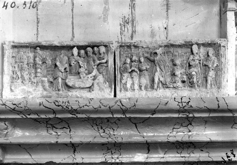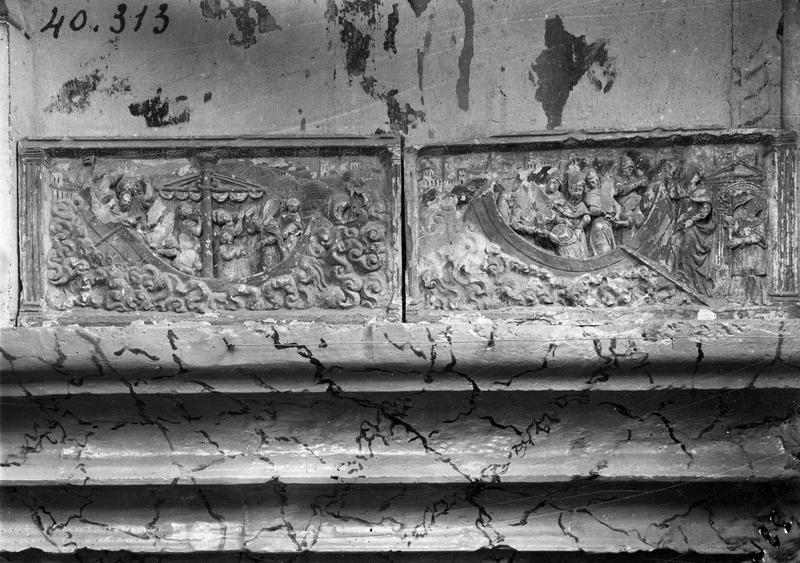 Retable de la chapelle des Fonts, légende de saint Nicolas, bas-relief, pierre, 16e siècle, 27-12-1913.