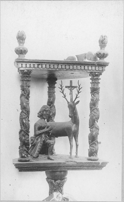 La Vision de saint Hubert, bâton de confrérie, bois polychrome, début du 17e siècle, 12-02-1960.