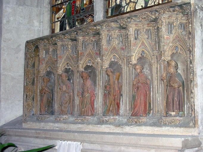 Les 6 apôtres sont sous des dais gothiques surmontés d'une frise végétale.