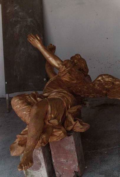 Deux anges grandeur nature soutiennent un reliquaire en forme d'urne.