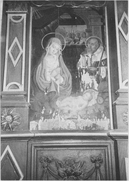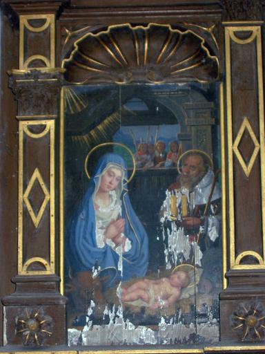 La Nativité et la Fuite en Egypte, panneaux peints, 16e siècle, remontés dans un retable du 19e siècle, 22-07-1983.