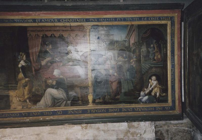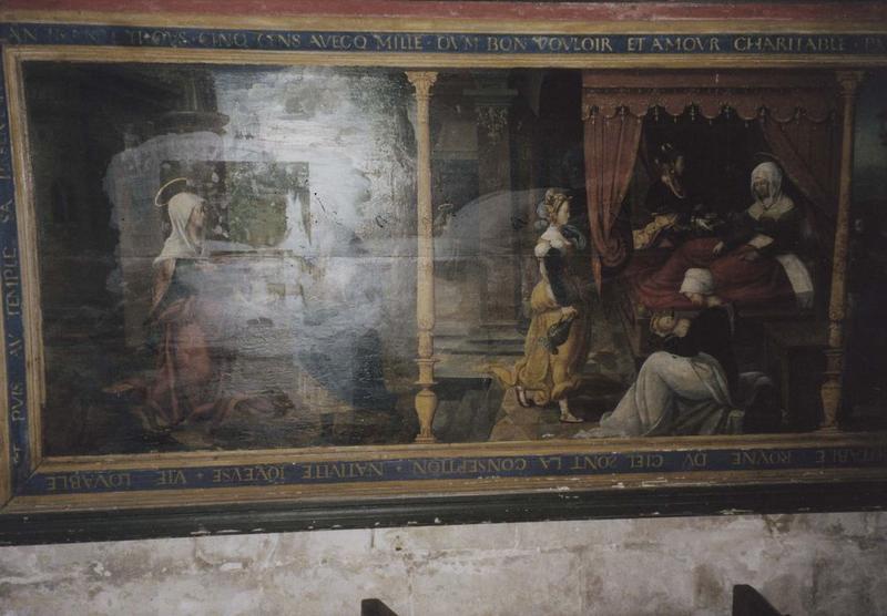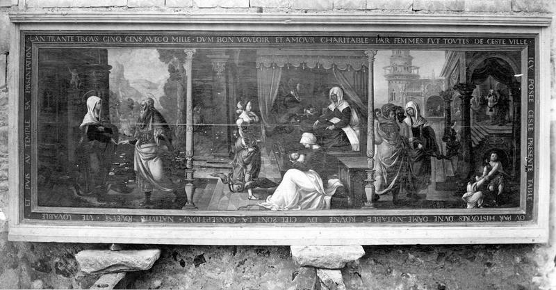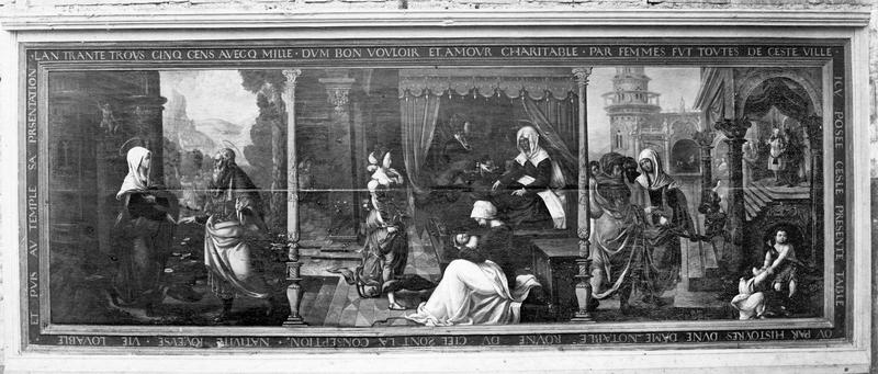 Transcription : L'AN TRANTE TROIS CINQ CENS AVECQ MILLE. DUM BON VOULOIR ET AMOUR CHARITABLE PAR FEMMES FUT TOUTES DE CESTE VILLE ICI POSEE CESTE PRESENTE TABLE OU PAR HISTOYRE D'UNE DAME NOTABLE ROYNE DU CIEL SONT LA CONSEPTION, NATIVITE JOYEUSE, VIE LOUABLE ET PUIS AU TEMPLE SA PRESENTATION.