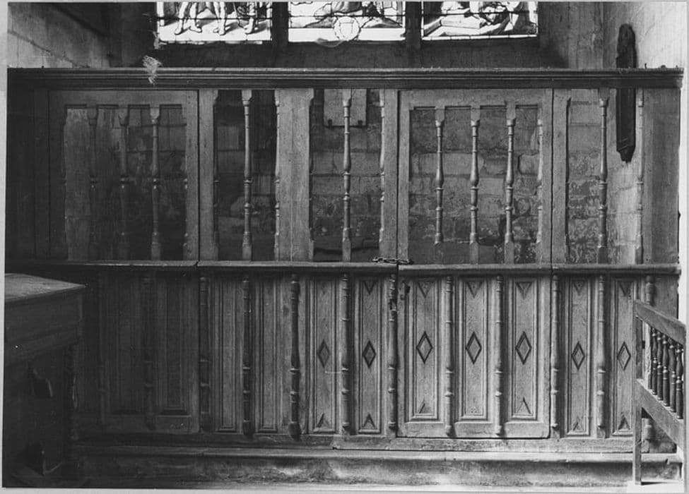 2 portes. Partie supérieure à balustres. Partie inférieure à caissons séparés par des balustres engagées. Décors plaqués ou incisés.