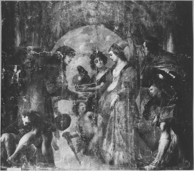 Au moment de son classement, le 5 mars 1970, le tableau fut identifié comme la Rencontre de Didon et d'Enée et attribué à un peintre de l'atelier de Rubens (Théodore Van Thulden ou Boeckhorst). Les recherches entreprises par Gilles Blieck, conservateur des Monuments historiques, DRAC Champagne-Ardenne, à l'occasion de la restauration de 2007, ont permis d'identifier son sujet (Mariage de Marie de Bourgogne avec Maximilien d'Autriche), son auteur (oeuvre conçue par Rubens et peinte par Jordaens) et de retracer l'histoire de l'oeuvre. Le tableau est la propriété de la commune de Sainte-Savine depuis 1954. Il lui a été offert par l'industriel Roger Perreau, fils du peintre aubois Raymond Perreau (1874-1976). Le tableau est conservé à la Maison pour tous de Sainte-Savine (ancienne mairie).
